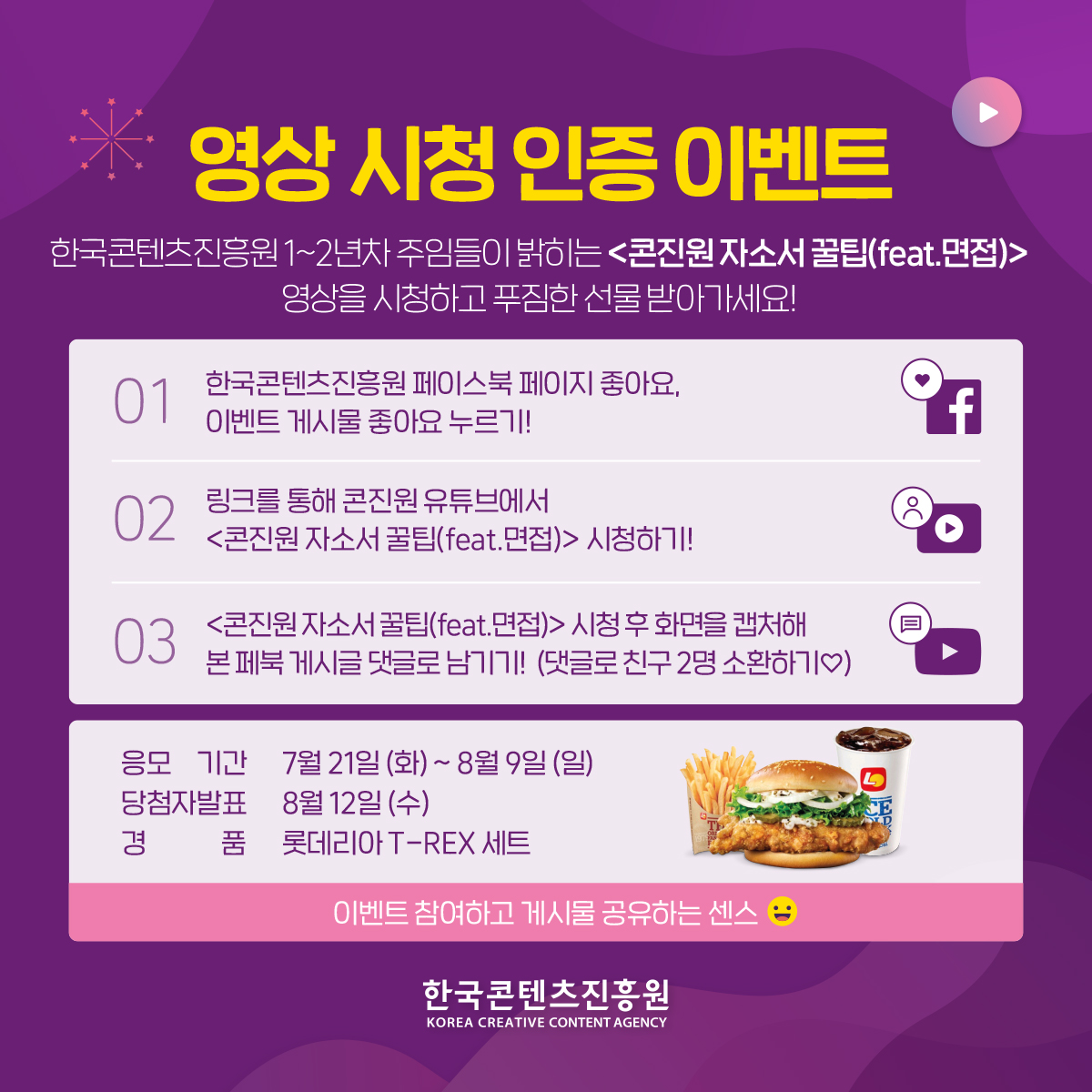 한국콘텐츠진흥원 1~2년차 주임들이 밝히는 콘진원 자소서 꿀팁(feat.면접)이 공개되었습니다. 신규 입사자들의 인터뷰로 보는 생생한 합격 꿀팁! 영상을 통해 콘진원 입사 스토리를 확인해보세요. 영상을 시청한 후 이벤트에 참여하면 푸짐한 선물도 받을 수 있답니다.