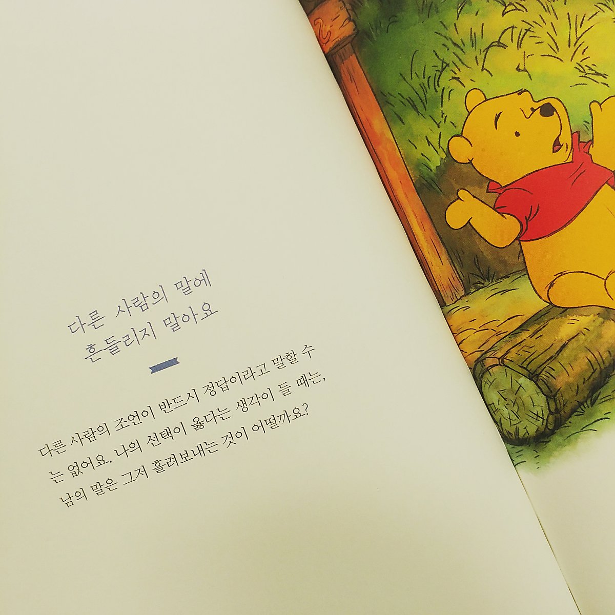 이러한 흐름은 2018년에도 이어졌습니다. 2018년 가장 많이 팔린 책은 캐릭터 왕국 디즈니의 곰돌이 푸가 주인공인 <곰돌이 푸, 행복한 일은 매일 있어>입니다. 이어 출판된 <곰돌이 푸, 서두르지 않아도 괜찮아>도 의미 있는 성공(베스트셀러 18위)을 거두었습니다. 곰돌이 푸는 1926년에 발표된 동화 <아기곰 푸>를 원작으로 한 디즈니의 1977년 애니메이션 <곰돌이 푸>의 주인공 캐릭터로, 애니메이션 개봉 이후 지금까지 디즈니의 대표 캐릭터로 전 세계적인 인기를 얻고 있습니다. 곰돌이 푸가 주인공인 두 권의 캐릭터 에세이에는 푸, 피글렛, 이요르, 티거 등 애니메이션 원작의 캐릭터들이 등장하는 배경 이미지 위에 짧은 잠언 형식의 문장들이 놓여 있습니다.