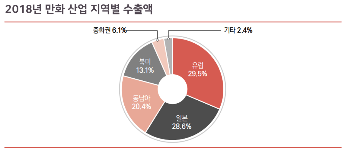 2018년 만화산업의 수출액은 전년 대비 14.9% 증가한 4,050만 달러로 지역별 수출액 현황을 보면, 유럽 29.5%, 일본 28.6%, 동남아 20.4%, 북미 13.1% 중화권에 6.1%를 수출한 것으로 조사됐습니다.