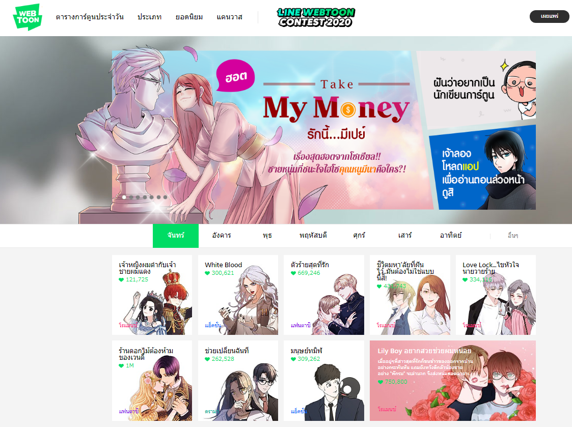 태국의 웹툰시장은 2014년 라인웹툰이 태국에 진출하면서 시작되었습니다. 현재 라인웹툰은 태국 안드로이드OS 어플리케이션 매출 순위에서 10위권을 기록 중입니다. 라인웹툰의 경우 전체 약 100여 개의 웹툰이 현재 연재 중이며, 총 116개의 완결된 작품을 열람할 수 있습니다. 2019년 7월 야옹이 작가의 <여신강림> 웹툰 구독자 약 150만 명, 태국 Theterm 작가의 <틴맘> 웹툰 구독자 약 230만 명, 진원 작가의 <체인지> 웹툰 구독자 100만 명 수준으로 주요 웹툰 구독자가 230 만 명에 이르고 있습니다. 이외에도 토리코믹스, 코미코, 욱비코믹스 등이 웹툰을 서비스하고 있습니다. 로맨스와 BL장르에 대한 선호도가 높은 편으로 여성 소비자가 많은 편입니다.