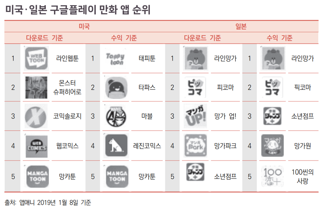 일본 만화 애플리케이션 매출 순위에서 슈에이샤 '소년점프+', 소학관 '망가원', 디엔에이 '망가박스' 등 일본의 대형 출판사들의 매출 순위가 국내 웹툰 플랫폼보다 낮은 것은 이들이 웹툰시장의 출현에 빠르게 대응하지 못하는 동안 일본 메신저 서비스를 선점한 라인망가와 현지화 전략을 시도한 픽코마, 코미코 등 국내 웹툰 플랫폼이 그 빈틈을 선점했기 때문입니다.