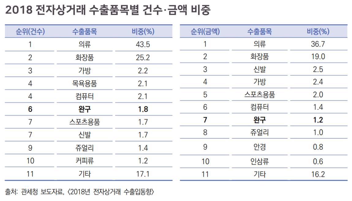 관세청에 따르면 2018년 전자상거래 수출, 즉 해외 소비자들이 국내 인터넷 사이트를 통해 직접 구매한 역(逆)직구는 2017년 대비 36% 증가한 961만 건, 전체 액수는 32.5억 달러(약 3조 9,000억 원)입니다. 2017년과 비교하면 건수는 36%, 금액은 25% 증가했습니다. 2018년 한국 전체 수출액이 5% 증가한 것과 비교하면 역직구는 5배에 달하는 성장세를 보인 셈입니다.