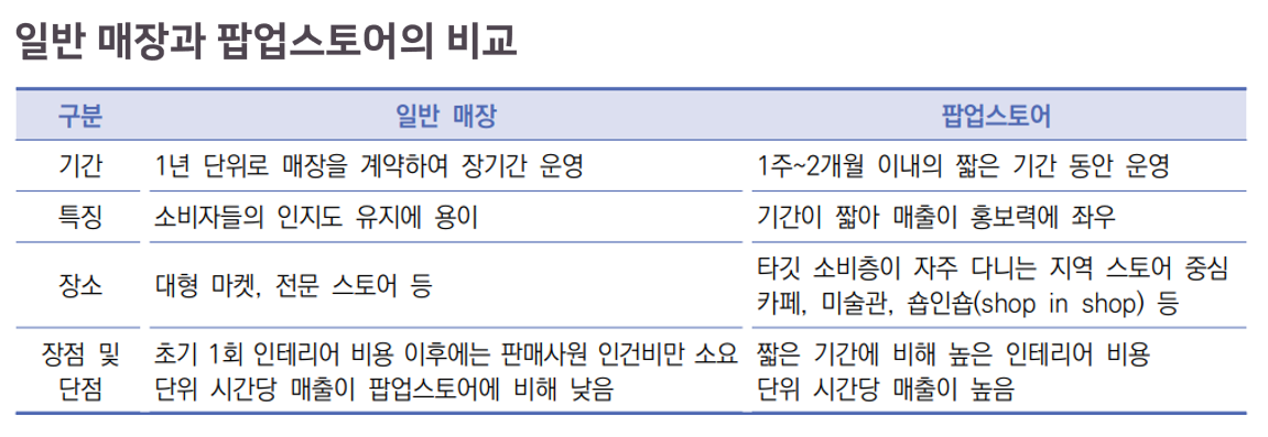팝업스토어는 짧은 판매시간에도 불구하고 체험의 장을 마련하기 위한 높은 인테리어 비용을 필요로 합니다. 그에 비해 매출 등 눈에 보이는 효과가 쉽게 나타나지 않는 경우도 많습니다. 다음 표는 P 브랜드가 11일간 백화점 팝업스토어를 운영한 데이터입니다. 그러나 체험을 전달하고 소비자의 입소문을 기대할 수 있는 마케팅 수단으로서 팝업스토어의 성과를 단순히 정량적으로 측정하기는 어렵습니다. 브랜드의 정체성과 개성 등을 직접 체험함으로써 소비자와 브랜드가 소통할 수 있다는 장점으로 인해 팝업스토어의 효용은 한동안 지속될 전망입니다.
