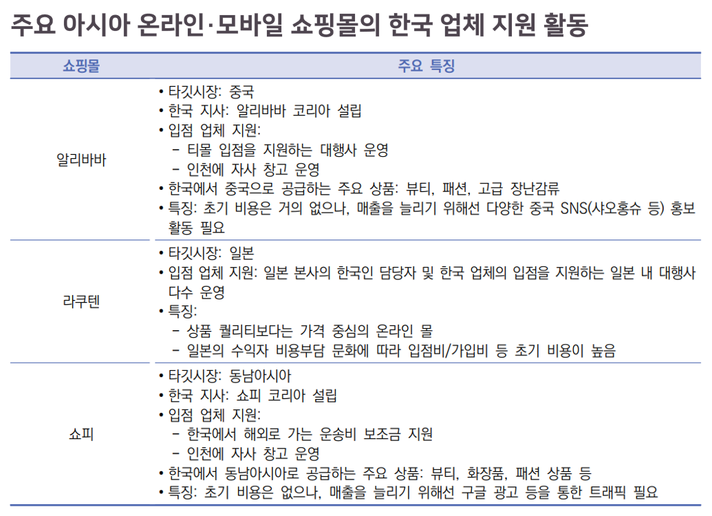 이에 따라 해외 유명 온라인 쇼핑 플랫폼이 한국에 직접 진출해 사업을 전개하는 사례도 늘고 있습니다. 중국 알리바바(Alibaba)의 타오바오(Taobao)와 티몰(Tmall), 일본의 라쿠텐(Rakuten), 동남아시아의 쇼피(Shopee) 등이 대표적입니다. 이를 통해 한국 캐릭터 상품은 아시아 전역으로 뻗어나가고 있습니다.