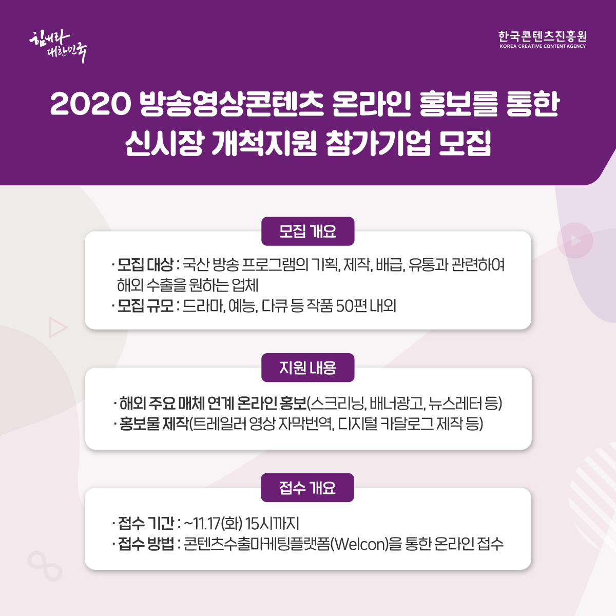•모집 대상 : 국산 방송 프로그램의 기획, 제작, 배급, 유통과 관련하여 해외 수출을 원하는 업체